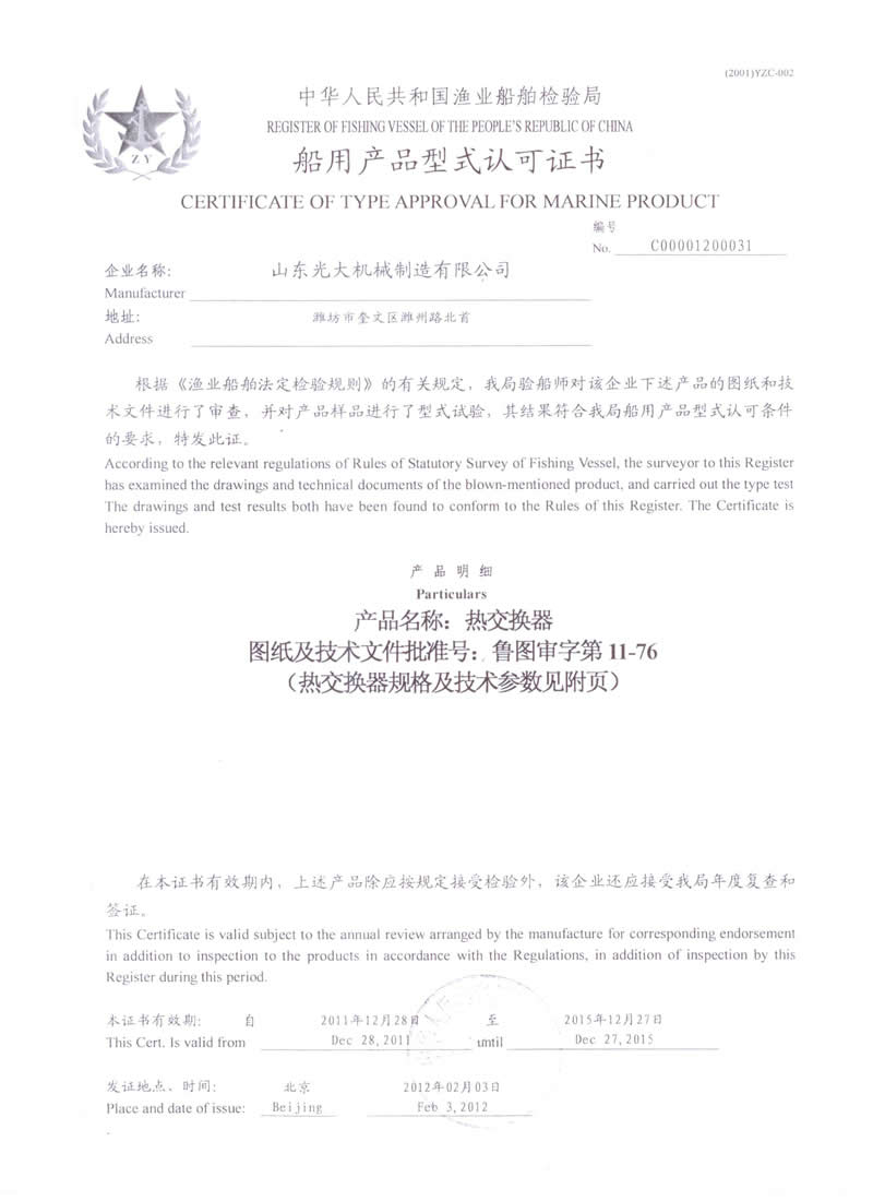 Heat exchanger - marine product type approval certificate