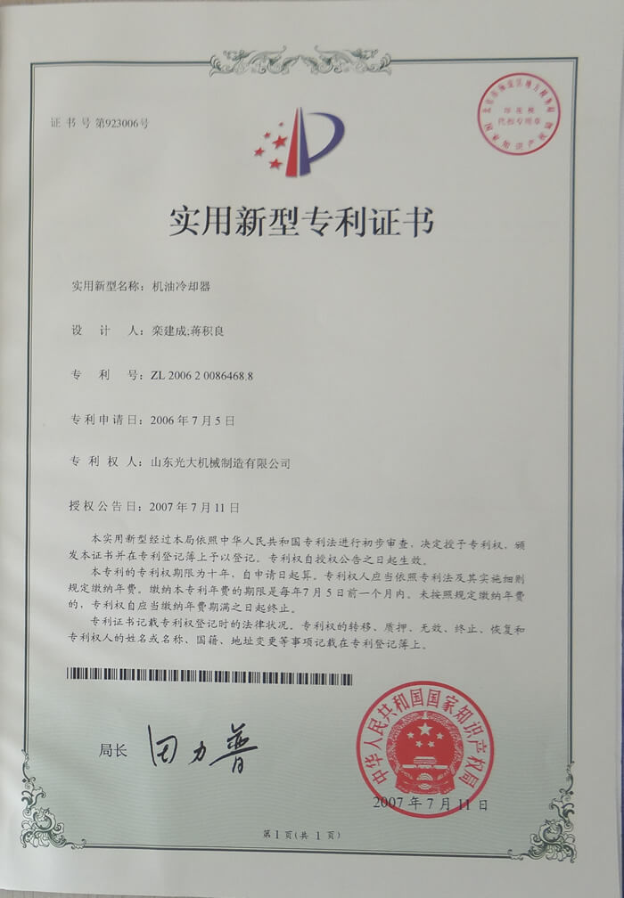 机油冷却器-实用新型专利证书